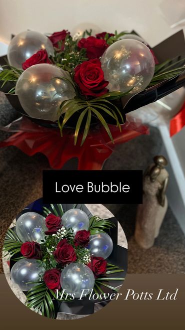 The cutest valentine’s arrangement of 6 of the biggest red roses and 5 bubble balloons in a perfect bouquet